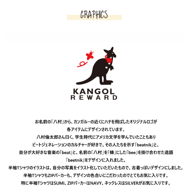 | 商品Data | カンガルーのロゴマークでおなじみ 国内の芸能人、海外セレブからも愛される 世界的に有名なブランド「KANGOL(カンゴール)」から ライフスタイルに特化した新コンセプトブランド。 「KANGOL REWARD」誕生!!! 【KANGOL REWARD コラボ企画】 八村倫太郎さんを迎えたコラボレーション企画! 受注期間限定半袖TシャツとZIPパーカー、ネックレスをご用意! 【デザイン】 ご自身が音楽をよくヘッドホンで聴いていることから、カンガルーの首にヘッドホンを付け、 お名前の「八村」から、カンガルーの近くにハチを飛ばしたオリジナルロゴが 各アイテムにデザインされています。 八村倫太郎さん曰く、学生時代にアメリカ文学を学んでいたこともあり ビートジェネレーションのカルチャーが好きで、その人たちを示す「beatnik」と、 自分が大好きな音楽の「beat」と、名前の「八村」を「蜂」にした「bee」を掛け合わせた造語 「beetnik」をデザインに入れました。 半袖Tシャツのイラストは、自分の写真をイラスト化していただいたもので、古着っぽいデザインにしました。 半袖TシャツもZIPパーカーも、デザインの色合いにこだわったのでとてもお気に入りです。 特に半袖TシャツはSUMI、ZIPパーカーはNAVY、ネックレスはSILVERがお気に入りです。 ここでしか手に入らない受注期間限定アイテムです!是非お買い求めください!!! ※商品の発送予定時期は 【8月上旬頃〜10月上旬頃順次発送予定】となります。 ※受注生産の為、発送予定時期が前後する場合がございます。 ※高額注文の場合には ご注文後にお電話にてご連絡をさせていただく場合がございます。 お電話にてご連絡が取れない場合にはメールにてご連絡させていただき、 ご連絡日より3日以内にご返信をいただけない場合には不正注文の可能性があると判断し トラブル防止のためご注文をキャンセルとさせていただきます。 ※商品によっては撮影時にサンプルを使用しているため若干仕様が異なる場合がございます。 また、サイズ・カラーによっては仕様が異なる場合もございます。 ※手作業で縫製をしているため縫製の仕様により、 個体差が生じてしまいますので、1〜2cm程度の誤差は予めご了承くださいませ。 ※洗濯機を使用した場合、お届け時のサイズより多少縮む場合がございます。 洗濯機を使用する場合は裏返してネットに入れることを推奨しております。 また、タンブラー乾燥機を使用しますとプリントが剥がれる恐れがありますので 避けていただきますようお願いいたします。 また、洗濯時の液温は40度以下とし、 塩素系および酸素系漂白剤の使用は避けていただきますようお願いいたします。 アイロンにつきましてもプリント及び刺繍部分は避け、 生地部分にアイロンをかける場合にはあて布をして110度(低温)にてお願いいたします。 ※また、受注生産とさせていただいておりますが、 各色・サイズ毎に生産数に限りがございます為、 生産数の上限に達しました場合在庫切れとなる場合がございます。 |