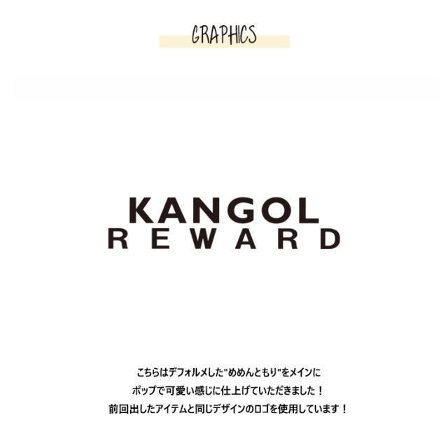 | 商品Data | カンガルーのロゴマークでおなじみ 国内の芸能人、海外セレブからも愛される 世界的に有名なブランド「KANGOL(カンゴール)」から ライフスタイルに特化した新コンセプトブランド。 「KANGOL REWARD」誕生!!! 【KANGOL REWARD コラボ企画】 めめんともりさんを迎えたコラボレーション企画第2弾! 受注期間限定長袖Tシャツ、ジョガーパンツ、クッションをご用意! 【デザイン】 めめんともりさんより こちらはデフォルメした"めめんともり"をメインに ポップで可愛い感じに仕上げていただきました! 前回出したアイテムと同じデザインのロゴを使用しています! ここでしか手に入らない受注期間限定アイテムです!是非お買い求めください!!! ※商品の発送予定時期は 【11月中旬頃〜11月下旬頃順次発送予定】となります。 ※受注生産の為、発送予定時期が前後する場合がございます。 ※高額注文の場合には ご注文後にお電話にてご連絡をさせていただく場合がございます。 お電話にてご連絡が取れない場合にはメールにてご連絡させていただき、 ご連絡日より3日以内にご返信をいただけない場合には不正注文の可能性があると判断し トラブル防止のためご注文をキャンセルとさせていただきます。 ※商品によっては撮影時にサンプルを使用しているため若干仕様が異なる場合がございます。 また、サイズ・カラーによっては仕様が異なる場合もございます。 ※手作業で縫製をしているため縫製の仕様により、 個体差が生じてしまいますので、1〜2cm程度の誤差は予めご了承くださいませ。 ※洗濯機を使用した場合、お届け時のサイズより多少縮む場合がございます。 洗濯機を使用する場合は裏返してネットに入れることを推奨しております。 また、タンブラー乾燥機を使用しますとプリントが剥がれる恐れがありますので 避けていただきますようお願いいたします。 また、洗濯時の液温は40度以下とし、 塩素系および酸素系漂白剤の使用は避けていただきますようお願いいたします。 アイロンにつきましてもプリント及び刺繍部分は避け、 生地部分にアイロンをかける場合にはあて布をして110度(低温)にてお願いいたします。 ※また、受注生産とさせていただいておりますが、 各色・サイズ毎に生産数に限りがございます為、 生産数の上限に達しました場合在庫切れとなる場合がございます。 |
