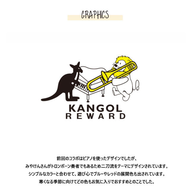 | 商品Data | カンガルーのロゴマークでおなじみ 国内の芸能人、海外セレブからも愛される 世界的に有名なブランド「KANGOL(カンゴール)」から ライフスタイルに特化した新コンセプトブランド。 「KANGOL REWARD」誕生!!! 【KANGOL REWARD コラボ企画】 みやけんさんを迎えたコラボレーション企画第2弾! 受注期間限定トレーナー、ZIPパーカー、デニムトートバッグをご用意! 【デザイン】 前回のコラボはピアノを使ったデザインでしたが、 みやけんさんがトロンボーン奏者でもあるため二刀流をテーマにデザインされています。 シンプルなカラーと合わせて、遊び心でブルーやレッドの展開色も出されています。 寒くなる季節に向けてどの色もお気に入りでおすすめとのことでした。 お使い頂けるシーズンを増やせるよう 程よい厚みとなっており、 春や秋にはメインアイテムとして 冬にはアウターのインナーアイテムとしてお使い頂けます。 ここでしか手に入らない受注期間限定アイテムです!是非お買い求めください!!! ※商品の発送予定時期は 【1月下旬頃〜2月上旬頃順次発送予定】となります。 ※受注生産の為、発送予定時期が前後する場合がございます。 ※高額注文の場合には ご注文後にお電話にてご連絡をさせていただく場合がございます。 お電話にてご連絡が取れない場合にはメールにてご連絡させていただき、 ご連絡日より3日以内にご返信をいただけない場合には不正注文の可能性があると判断し トラブル防止のためご注文をキャンセルとさせていただきます。 ※商品によっては撮影時にサンプルを使用しているため若干仕様が異なる場合がございます。 また、サイズ・カラーによっては仕様が異なる場合もございます。 ※手作業で縫製をしているため縫製の仕様により、 個体差が生じてしまいますので、1〜2cm程度の誤差は予めご了承くださいませ。 ※洗濯機を使用した場合、お届け時のサイズより多少縮む場合がございます。 洗濯機を使用する場合は裏返してネットに入れることを推奨しております。 また、タンブラー乾燥機を使用しますとプリントが剥がれる恐れがありますので 避けていただきますようお願いいたします。 また、洗濯時の液温は40度以下とし、 塩素系および酸素系漂白剤の使用は避けていただきますようお願いいたします。 アイロンにつきましてもプリント及び刺繍部分は避け、 生地部分にアイロンをかける場合にはあて布をして110度(低温)にてお願いいたします。 ※また、受注生産とさせていただいておりますが、 各色・サイズ毎に生産数に限りがございます為、 生産数の上限に達しました場合在庫切れとなる場合がございます。 |