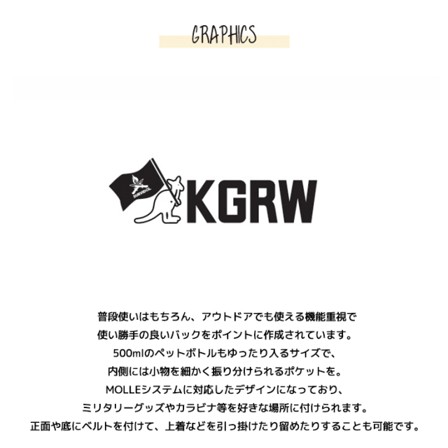 カンガルーのロゴマークでおなじみ 国内の芸能人、海外セレブからも愛される 世界的に有名なブランド「KANGOL(カンゴール)」から ライフスタイルに特化した新コンセプトブランド。 「KANGOL REWARD」誕生!!! 【KANGOL REWARD コラボ企画】 さばいどる かほなんさんを迎えたコラボレーション企画第5弾! 【デザイン】 普段使いはもちろん、アウトドアでも使える機能重視で使い勝手の良いバックをポイントに作成されています。 500mlのペットボトルもゆったり入るサイズで、内側には小物を細かく振り分けられるポケットを。 MOLLEシステムに対応したデザインになっており、ミリタリーグッズやカラビナ等を好きな場所に付けられます。 正面や底にベルトを付けて、上着などを引っ掛けたり留めたりすることも可能です。 ここでしか手に入らない受注期間限定アイテムです!是非お買い求めください!!! ※商品の発送予定時期は 【8月中旬頃〜8月下旬頃順次発送予定】となります。 ※受注生産の為、発送予定時期が前後する場合がございます。 ※高額注文の場合には ご注文後にお電話にてご連絡をさせていただく場合がございます。 お電話にてご連絡が取れない場合にはメールにてご連絡させていただき、 ご連絡日より3日以内にご返信をいただけない場合には不正注文の可能性があると判断し トラブル防止のためご注文をキャンセルとさせていただきます。 ※商品によっては撮影時にサンプルを使用しているため若干仕様が異なる場合がございます。 また、サイズ・カラーによっては仕様が異なる場合もございます。 ※手作業で縫製をしているため縫製の仕様により、 個体差が生じてしまいますので、1〜2cm程度の誤差は予めご了承くださいませ。 ※洗濯機を使用した場合、お届け時のサイズより多少縮む場合がございます。 洗濯機を使用する場合は裏返してネットに入れることを推奨しております。 また、タンブラー乾燥機を使用しますとプリントが剥がれる恐れがありますので 避けていただきますようお願いいたします。 また、洗濯時の液温は40度以下とし、 塩素系および酸素系漂白剤の使用は避けていただきますようお願いいたします。 アイロンにつきましてもプリント及び刺繍部分は避け、 生地部分にアイロンをかける場合にはあて布をして110度(低温)にてお願いいたします。 ※また、受注生産とさせていただいておりますが、 各色・サイズ毎に生産数に限りがございます為、 生産数の上限に達しました場合在庫切れとなる場合がございます。 |