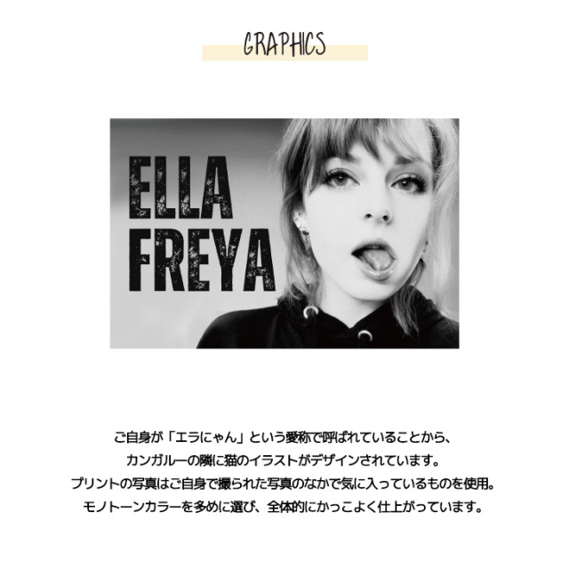 カンガルーのロゴマークでおなじみ 国内の芸能人、海外セレブからも愛される 世界的に有名なブランド「KANGOL(カンゴール)」から ライフスタイルに特化した新コンセプトブランド。 「KANGOL REWARD」誕生!!! 【KANGOL REWARD コラボ企画】 EllaFreyaさんを迎えたコラボレーション企画! 受注期間限定半袖Tシャツ、長袖Tシャツ、ZIPパーカー、クッションをご用意! 【デザイン】 ご自身が「エラにゃん」という愛称で呼ばれていることから、 カンガルーの隣に猫のイラストがデザインされています。 プリントの写真はご自身で撮られた写真のなかで気に入っているものを使用。 モノトーンカラーを多めに選び、全体的にかっこよく仕上がっています。 ここでしか手に入らない受注期間限定アイテムです!是非お買い求めください!!! ※商品の発送予定時期は【1月下旬頃〜2月上旬頃順次発送予定】となります。 ※高額注文の場合には ご注文後にお電話にてご連絡をさせていただく場合がございます。 お電話にてご連絡が取れない場合にはメールにてご連絡させていただき、 ご連絡日より3日以内にご返信をいただけない場合には不正注文の可能性があると判断し トラブル防止のためご注文をキャンセルとさせていただきます。 ※商品によっては撮影時にサンプルを使用しているため若干仕様が異なる場合がございます。 また、サイズ・カラーによっては仕様が異なる場合もございます。 ※手作業で縫製をしているため縫製の仕様により、 個体差が生じてしまいますので、1〜2cm程度の誤差は予めご了承くださいませ。 ※洗濯機を使用した場合、お届け時のサイズより多少縮む場合がございます。 洗濯機を使用する場合は裏返してネットに入れることを推奨しております。 また、タンブラー乾燥機を使用しますとプリントが剥がれる恐れがありますので 避けていただきますようお願いいたします。 また、洗濯時の液温は40度以下とし、 塩素系および酸素系漂白剤の使用は避けていただきますようお願いいたします。 アイロンにつきましてもプリント及び刺繍部分は避け、 生地部分にアイロンをかける場合にはあて布をして110度(低温)にてお願いいたします。 ※また、受注生産とさせていただいておりますが、 各色・サイズ毎に生産数に限りがございます為、 生産数の上限に達しました場合在庫切れとなる場合がございます。 |