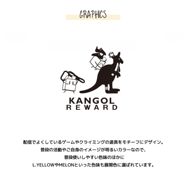 カンガルーのロゴマークでおなじみ 国内の芸能人、海外セレブからも愛される 世界的に有名なブランド「KANGOL(カンゴール)」から ライフスタイルに特化した新コンセプトブランド。 「KANGOL REWARD」誕生!!! 【KANGOL REWARD コラボ企画】 んそめさんを迎えたコラボレーション企画! 受注期間限定半袖Tシャツ、長袖Tシャツ、プルオーバーパーカーをご用意! 【デザイン】 配信でよくしているゲームやクライミングの道具をモチーフにデザイン。 普段の活動やご自身のイメージが明るいカラーなので、 普段使いしやすい色味のほかにL.YELLOWやMELONといった色味も展開色に選ばれています。 ここでしか手に入らない受注期間限定アイテムです!是非お買い求めください!!! ※現時点での商品の発送予定時期は【4月中旬〜4月下旬頃順次発送】を予定しております。 尚、工場の生産の都合上、お客様のご入金・決済のタイミングにより前後する場合がございます。 予めご了承ください。 ※商品代金が10万円以上にて代引き決済を利用してのご注文につきましては、 トラブル防止のため、決済方法をクレジットカード決済もしくはコンビニ決済に変更 させていただく場合がございます。変更前にお電話、メールにてご連絡をさせていただきます。※ ※商品によっては撮影時にサンプルを使用しているため若干仕様が異なる場合がございます。 また、サイズ・カラーによっては仕様が異なる場合もございます。 ※手作業で縫製をしているため縫製の仕様により、 個体差が生じてしまいますので、1〜2cm程度の誤差は予めご了承くださいませ。 ※洗濯機を使用した場合、お届け時のサイズより多少縮む場合がございます。 洗濯機を使用する場合は裏返してネットに入れることを推奨しております。 また、タンブラー乾燥機を使用しますとプリントが剥がれる恐れがありますので 避けていただきますようお願いいたします。 また、洗濯時の液温は40度以下とし、 塩素系および酸素系漂白剤の使用は避けていただきますようお願いいたします。 アイロンにつきましてもプリント及び刺繍部分は避け、 生地部分にアイロンをかける場合にはあて布をして110度(低温)にてお願いいたします。 ※また、受注生産とさせていただいておりますが、 各色・サイズ毎に生産数に限りがございます為、 生産数の上限に達しました場合在庫切れとなる場合がございます。 予めご了承頂けますようお願い致します。 |