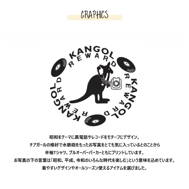 カンガルーのロゴマークでおなじみ 国内の芸能人、海外セレブからも愛される 世界的に有名なブランド「KANGOL(カンゴール)」から ライフスタイルに特化した新コンセプトブランド。 「KANGOL REWARD」誕生!!! 【KANGOL REWARD コラボ企画】 阪田マリンさんを迎えたコラボレーション企画! 受注期間限定半袖Tシャツ、プルオーバーパーカー、ネックレスをご用意! 【デザイン】 昭和をテーマに黒電話やレコードをモチーフにデザイン。 チアガールの格好で水鉄砲をもったお写真をとても気に入っているとのことから 半袖Tシャツ、プルオーバーパーカーともにプリントしています。 お写真の下の言葉は「昭和、平成、令和のいろんな時代を楽しむ」という意味を込めています。 着やすいデザインやオールシーズン使えるアイテムを選びました。 ここでしか手に入らない受注期間限定アイテムです!是非お買い求めください!!! ※商品の発送予定時期は【6月中旬頃〜6月下旬頃順次発送予定】となります。 ※高額注文の場合には ご注文後にお電話にてご連絡をさせていただく場合がございます。 お電話にてご連絡が取れない場合にはメールにてご連絡させていただき、 ご連絡日より3日以内にご返信をいただけない場合には不正注文の可能性があると判断し トラブル防止のためご注文をキャンセルとさせていただきます。 ※商品によっては撮影時にサンプルを使用しているため若干仕様が異なる場合がございます。 また、サイズ・カラーによっては仕様が異なる場合もございます。 ※手作業で縫製をしているため縫製の仕様により、 個体差が生じてしまいますので、1〜2cm程度の誤差は予めご了承くださいませ。 ※洗濯機を使用した場合、お届け時のサイズより多少縮む場合がございます。 洗濯機を使用する場合は裏返してネットに入れることを推奨しております。 また、タンブラー乾燥機を使用しますとプリントが剥がれる恐れがありますので 避けていただきますようお願いいたします。 また、洗濯時の液温は40度以下とし、 塩素系および酸素系漂白剤の使用は避けていただきますようお願いいたします。 アイロンにつきましてもプリント及び刺繍部分は避け、 生地部分にアイロンをかける場合にはあて布をして110度(低温)にてお願いいたします。 ※また、受注生産とさせていただいておりますが、 各色・サイズ毎に生産数に限りがございます為、 生産数の上限に達しました場合在庫切れとなる場合がございます。 |