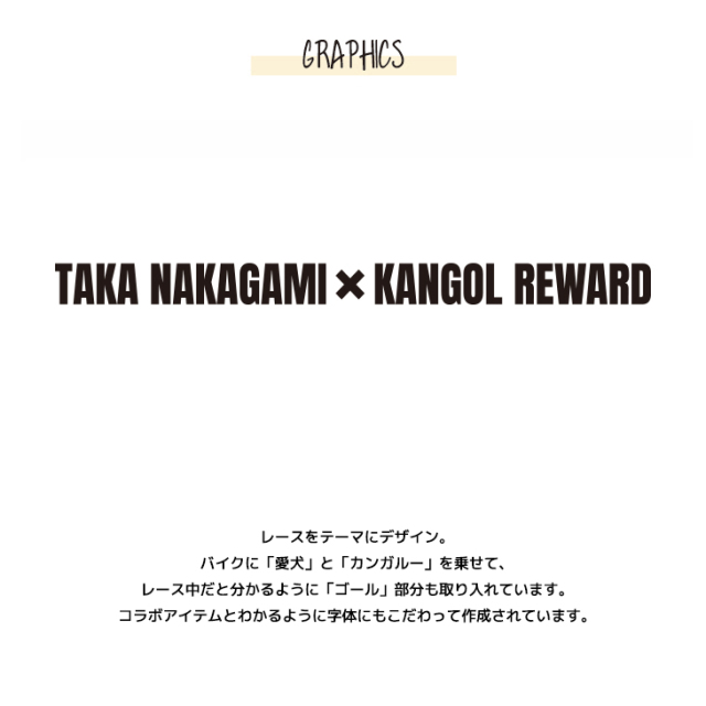 カンガルーのロゴマークでおなじみ 国内の芸能人、海外セレブからも愛される 世界的に有名なブランド「KANGOL(カンゴール)」から ライフスタイルに特化した新コンセプトブランド。 「KANGOL REWARD」誕生!!! 【KANGOL REWARD コラボ企画】 中上貴晶さんとのコラボ企画! 今回のコラボは半袖Tシャツ、プルオーバーパーカー、トートバッグをリリース。 【デザイン】 レースをテーマにデザイン。 バイクに「愛犬」と「カンガルー」を乗せて、レース中だと分かるように「ゴール」部分も取り入れています。 コラボアイテムとわかるように字体にもこだわって作成されています。 ここでしか手に入らない受注期間限定アイテムです!是非お買い求めください!!! ※現時点での商品の発送予定時期は【2月中旬頃〜2月下旬頃順次発送予定】 を予定しております。 尚、工場の生産の都合上、お客様のご入金・決済のタイミングにより前後する場合がございます。 予めご了承ください。 ※商品代金が10万円以上にて代引き決済を利用してのご注文につきましては、 トラブル防止のため、決済方法をクレジットカード決済もしくはコンビニ決済に変更 させていただく場合がございます。変更前にお電話、メールにてご連絡をさせていただきます。※ ※商品によっては撮影時にサンプルを使用しているため若干仕様が異なる場合がございます。 また、サイズ・カラーによっては仕様が異なる場合もございます。 ※手作業で縫製をしているため縫製の仕様により、 個体差が生じてしまいますので、1〜2cm程度の誤差は予めご了承くださいませ。 ※洗濯機を使用した場合、お届け時のサイズより多少縮む場合がございます。 洗濯機を使用する場合は裏返してネットに入れることを推奨しております。 また、タンブラー乾燥機を使用しますとプリントが剥がれる恐れがありますので 避けていただきますようお願いいたします。 また、洗濯時の液温は40度以下とし、 塩素系および酸素系漂白剤の使用は避けていただきますようお願いいたします。 アイロンにつきましてもプリント及び刺繍部分は避け、 生地部分にアイロンをかける場合にはあて布をして110度(低温)にてお願いいたします。 ※また、受注生産とさせていただいておりますが、 各色・サイズ毎に生産数に限りがございます為、 生産数の上限に達しました場合在庫切れとなる場合がございます。 予めご了承頂けますようお願い致します。 |