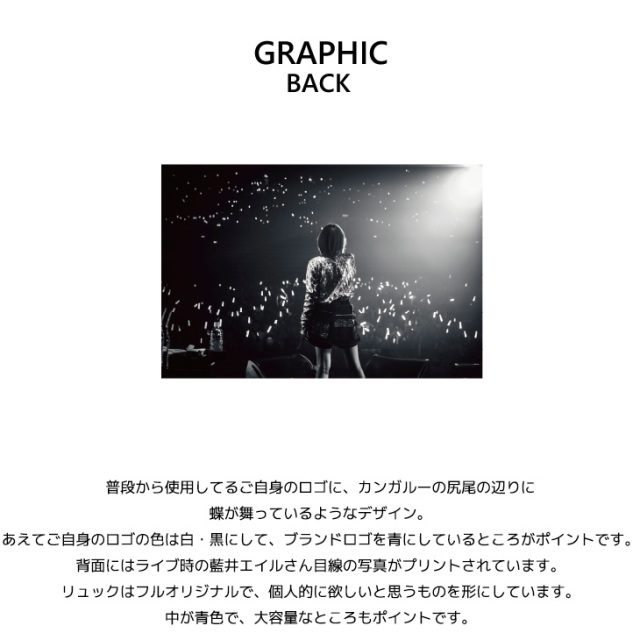 カンガルーのロゴマークでおなじみ 国内の芸能人、海外セレブからも愛される 世界的に有名なブランド「KANGOL(カンゴール)」から ライフスタイルに特化した新コンセプトブランド。 「KANGOL REWARD」誕生!!! 【KANGOL REWARD コラボ企画】 藍井エイルさんを迎えたコラボレーション企画! 受注期間限定長袖Tシャツ、リュックをご用意! 【デザイン】 普段から使用してるご自身のロゴに、カンガルーの尻尾の辺りに蝶が舞っているようなデザイン。 あえてご自身のロゴの色は白・黒にして、ブランドロゴを青にしているところがポイントです。 背面にはライブ時の藍井エイルさん目線の写真がプリントされています。 リュックはフルオリジナルで、個人的に欲しいと思うものを形にしています。 中が青色で、大容量なところもポイントです。 ここでしか手に入らない受注期間限定アイテムです!是非お買い求めください!!! ※商品の発送予定時期は【5月下旬頃〜6月上旬頃順次発送】 となります。 ※高額注文の場合には ご注文後にお電話にてご連絡をさせていただく場合がございます。 お電話にてご連絡が取れない場合にはメールにてご連絡させていただき、 ご連絡日より3日以内にご返信をいただけない場合には不正注文の可能性があると判断し トラブル防止のためご注文をキャンセルとさせていただきます。 ※商品によっては撮影時にサンプルを使用しているため若干仕様が異なる場合がございます。 また、サイズ・カラーによっては仕様が異なる場合もございます。 ※手作業で縫製をしているため縫製の仕様により、 個体差が生じてしまいますので、1〜2cm程度の誤差は予めご了承くださいませ。 ※洗濯機を使用した場合、お届け時のサイズより多少縮む場合がございます。 洗濯機を使用する場合は裏返してネットに入れることを推奨しております。 また、タンブラー乾燥機を使用しますとプリントが剥がれる恐れがありますので 避けていただきますようお願いいたします。 また、洗濯時の液温は40度以下とし、 塩素系および酸素系漂白剤の使用は避けていただきますようお願いいたします。 アイロンにつきましてもプリント及び刺繍部分は避け、 生地部分にアイロンをかける場合にはあて布をして110度(低温)にてお願いいたします。 ※また、受注生産とさせていただいておりますが、 各色・サイズ毎に生産数に限りがございます為、 生産数の上限に達しました場合在庫切れとなる場合がございます。 |